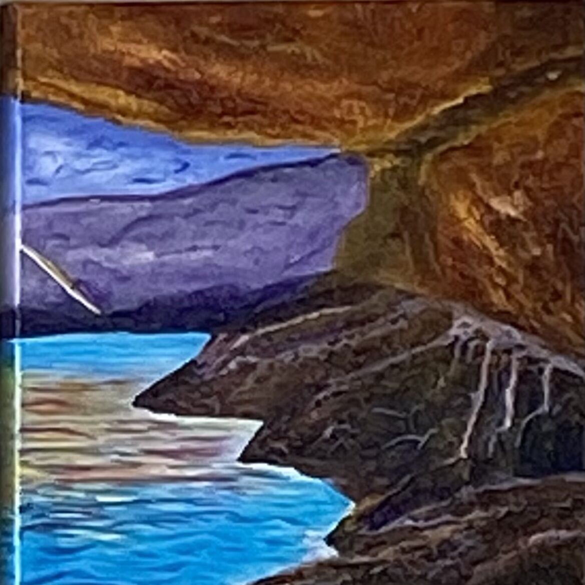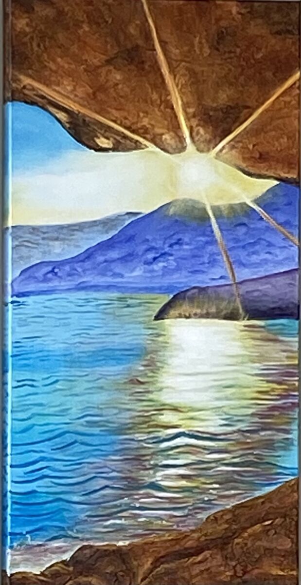 5 gallery wrapped canvases placed together to give a view from a cave looking out at sun set total width 68”x36”